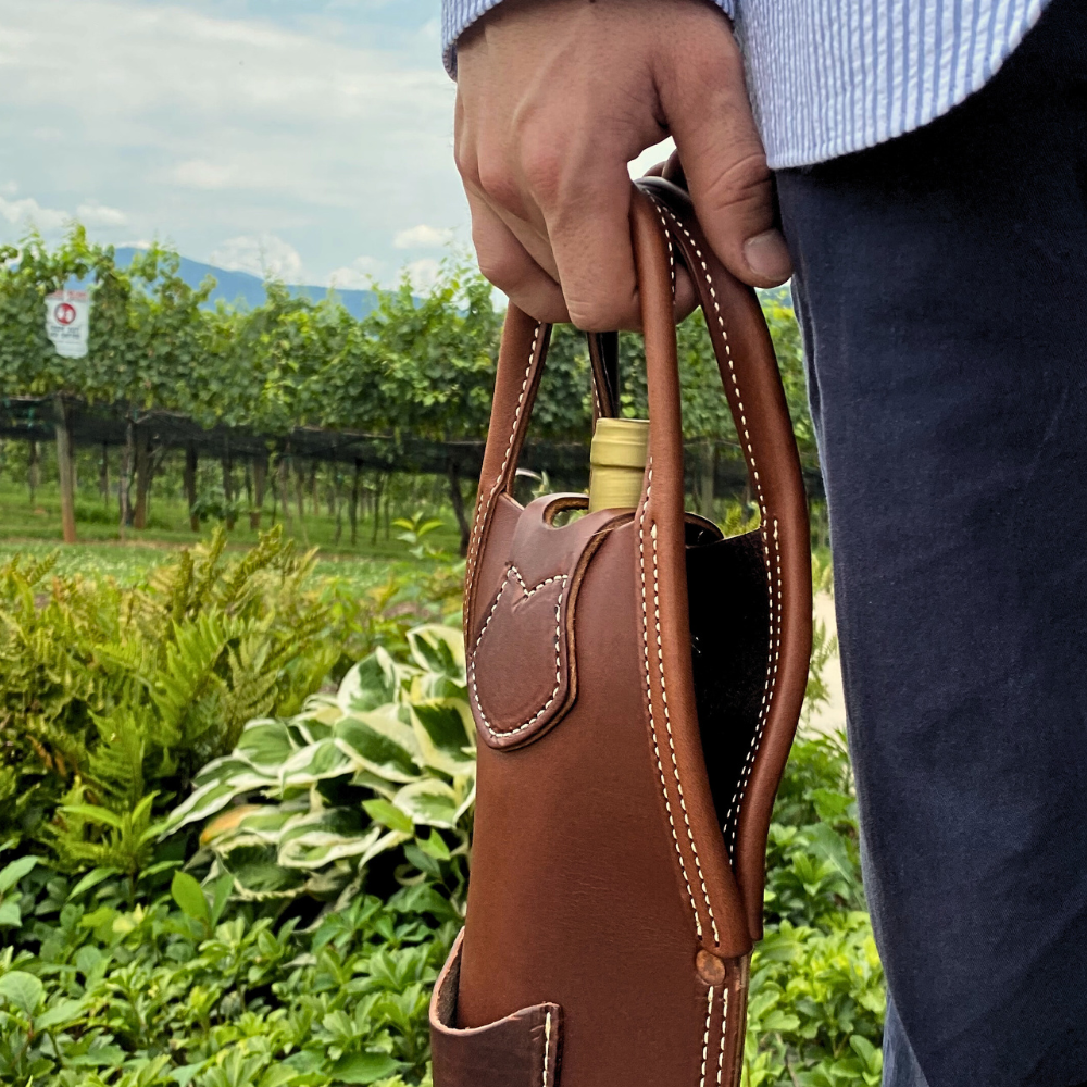 The Single Barrel was the result of countless occasions when Kingfisher Founder Luke Kolbie wanted to take a bottle of wine out on the boat, or to a dinner party, but had no protective carrier to ensure it didn't end up getting busted. This unique and original design provides a protective, convenient, and eye-catching way to carry any standard size bottle of wine, whisky, or other libation. Tailgates, dinner parties, and picnics are all in the wheelhouse of this versatile tote. Handcrafted by American artisans with full-grain vegetable tanned equestrian leathers, it is built to endure for generations. If you should need to carry two bottles, view the Double Barrel tote.