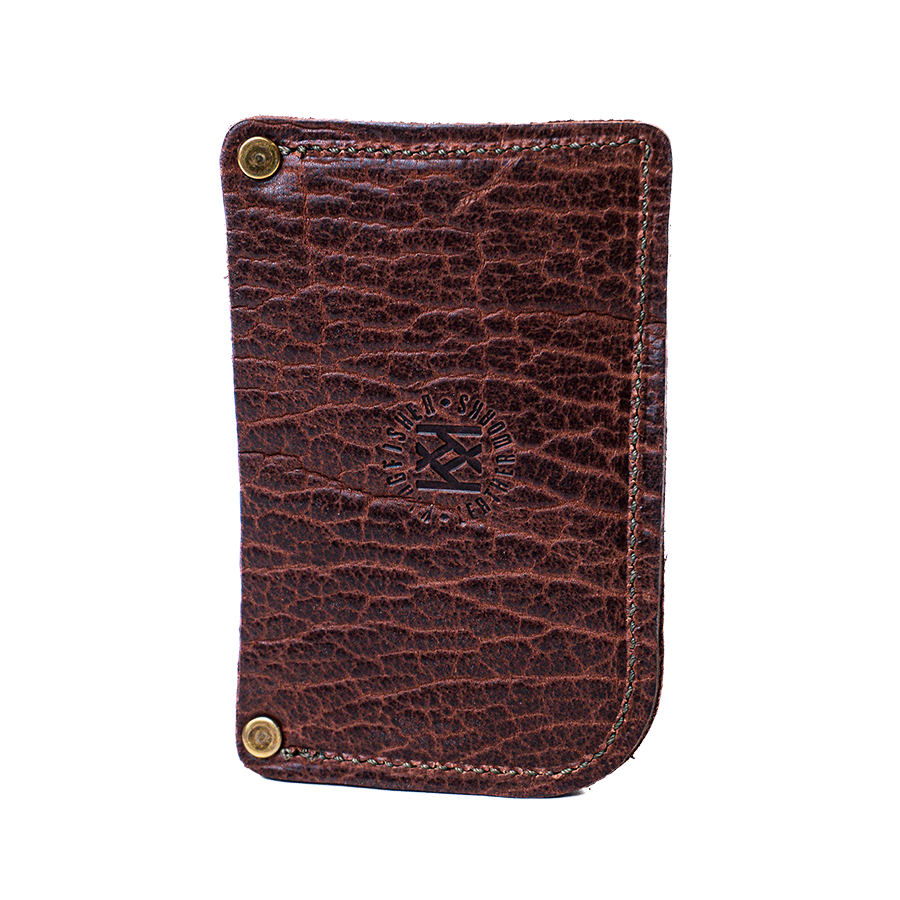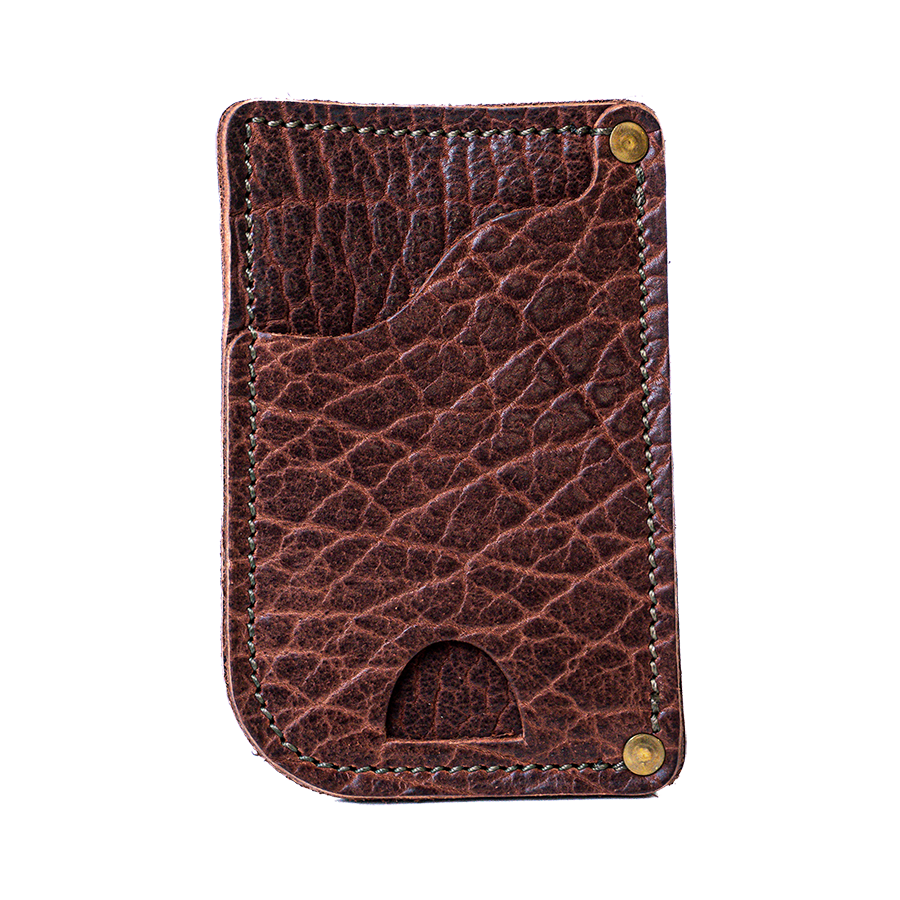 After driving long distances sitting on a wallet, I decided that for back health I should start putting my wallet in a front pocket. After years of design and testing, I have perfected this design into the most functional wallet for front pocket use. Room for plenty of cards and cash with its two pockets and easy access to your most used cards in the front. The thumb slot in the bottom allows you to push cards up out of the front pocket for even greater ease of access. Handcrafted by our American artisans with full-grain Cognac Bison, it is built to endure for generations.