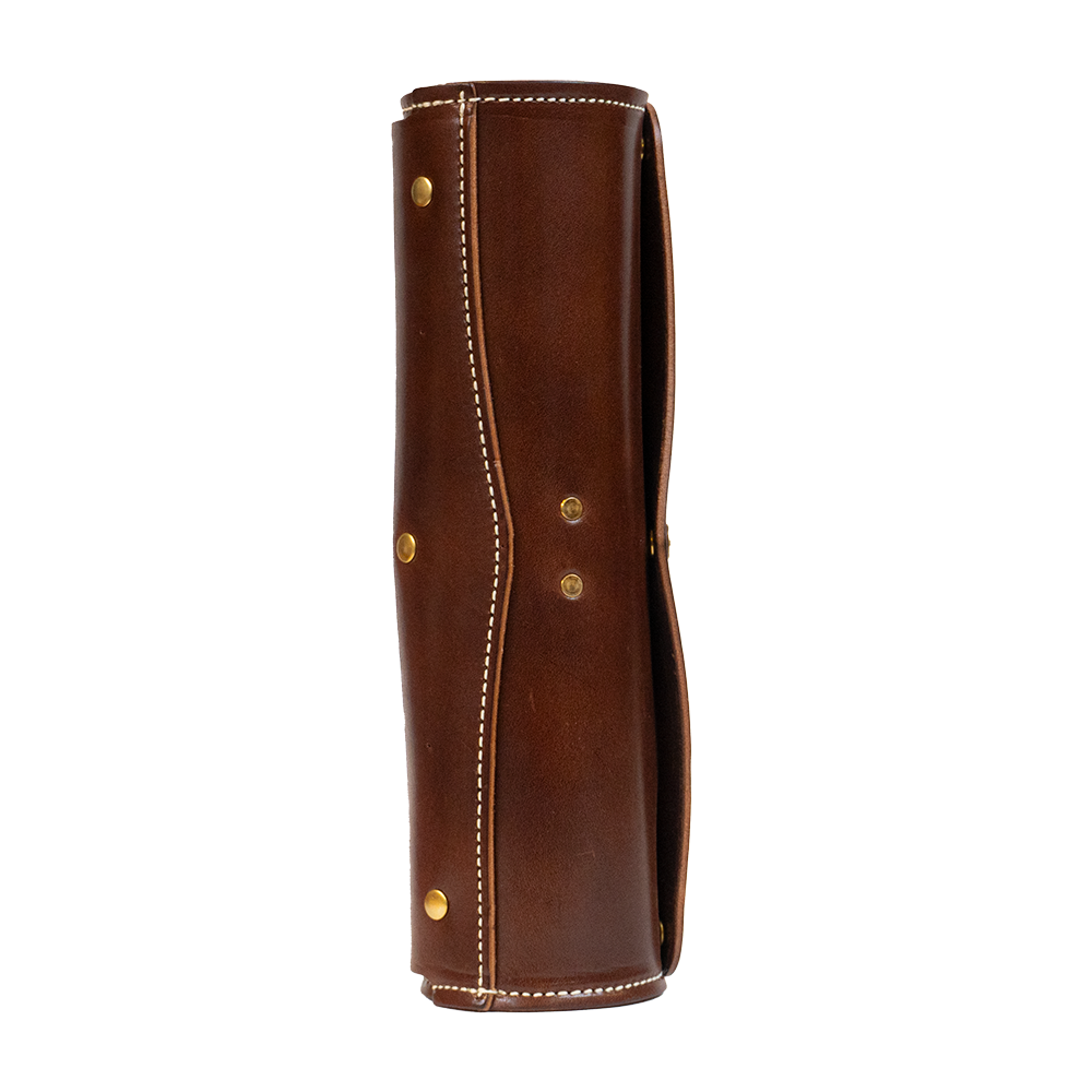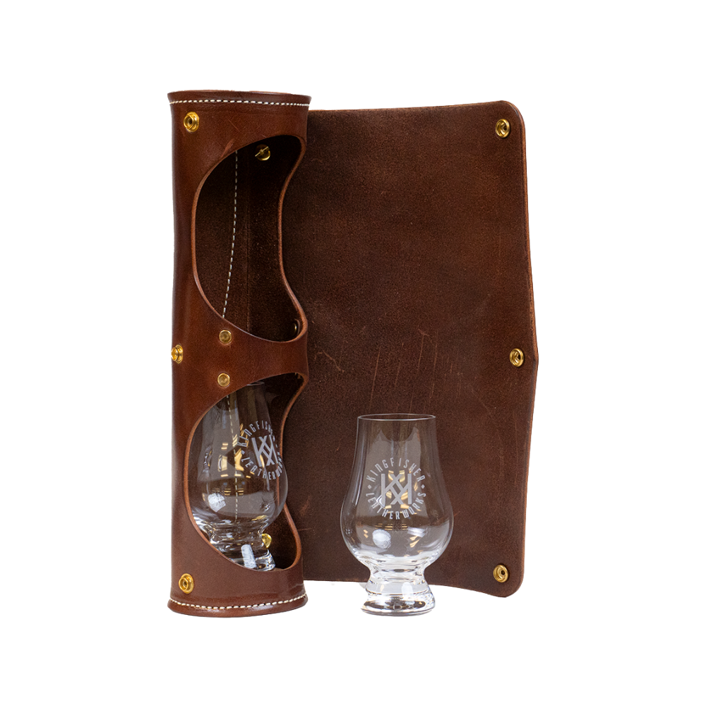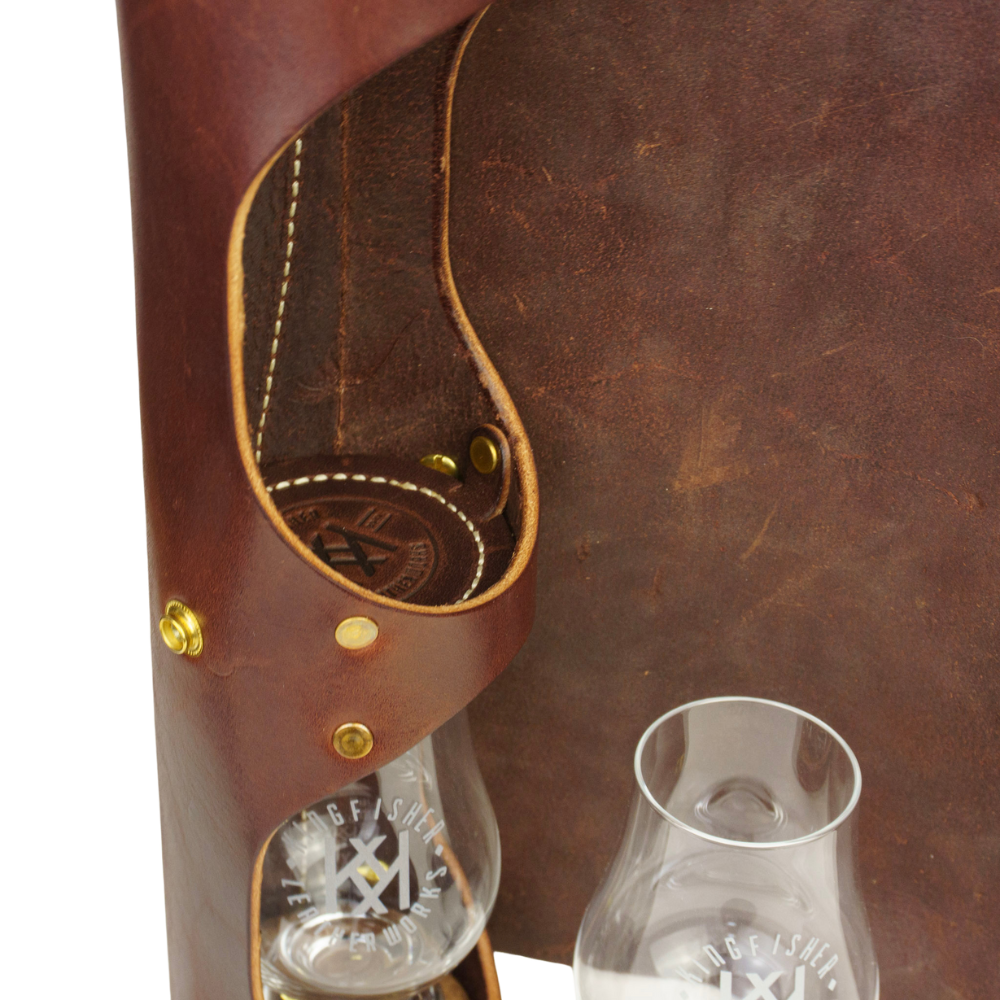 Over the last few years Kingfisher customers have increasingly used our Single Barrel and Double Barrel bottle totes for carrying Whiskey to tailgates, after-hunt toasts, and evening soirees. To make the experience that much better, we designed one of our most complicated products yet: The Highland Glass Case. Our heavy harness leather completely encases two compartments for the included Genuine Scottish Glencairn glasses. Solid brass snaps ensure security and allow swift entry into the case. As a standalone product the glass case provides ample protection for the glasses, but it is primarily designed to fit into one side of the Double Barrel tote for truly drop proof protection at carrying height of 1 meter. As a gift, the Highland Glass Case is a entirely unique item that will be enjoyed for generations to come.