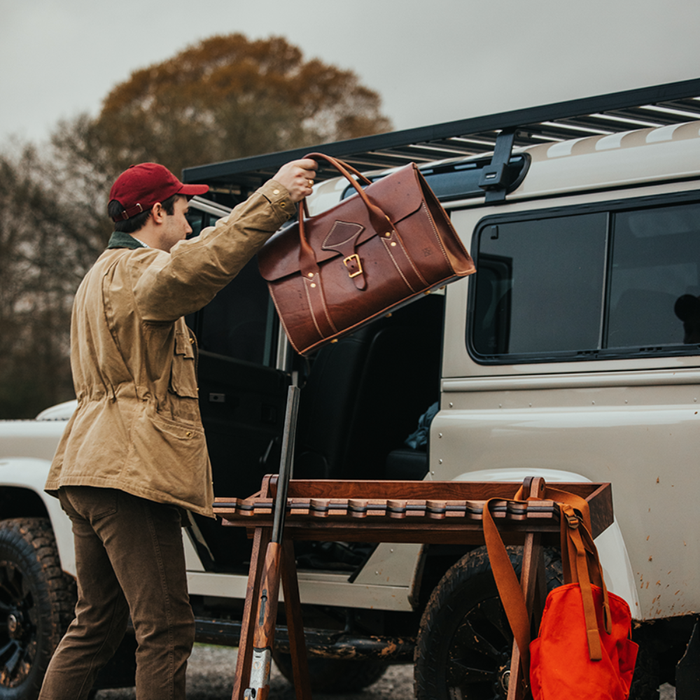 After years of studying the old Doctor's Bags, I finally put my pages of notes and sketches to use and the result is the Kingfisher Physician's Weekender. Designed to be the successor of the classic doctor's bag, the Physician's Weekender keeps the same style and purpose but adds a longer lasting Kingfisher closure system, Full-grain equestrian leather construction, hammered seams, cleats, Brass hardware, Brass rivets and drop handles. Two full width end pockets for cords and small objects are handy in the large compartment which has enough space for a pair of shoes, two or three sets of clothes, toiletries and undergarments. Its meant for use on one to three day trips on its own or as a carry-on to supplement a checked bag for longer stays.
